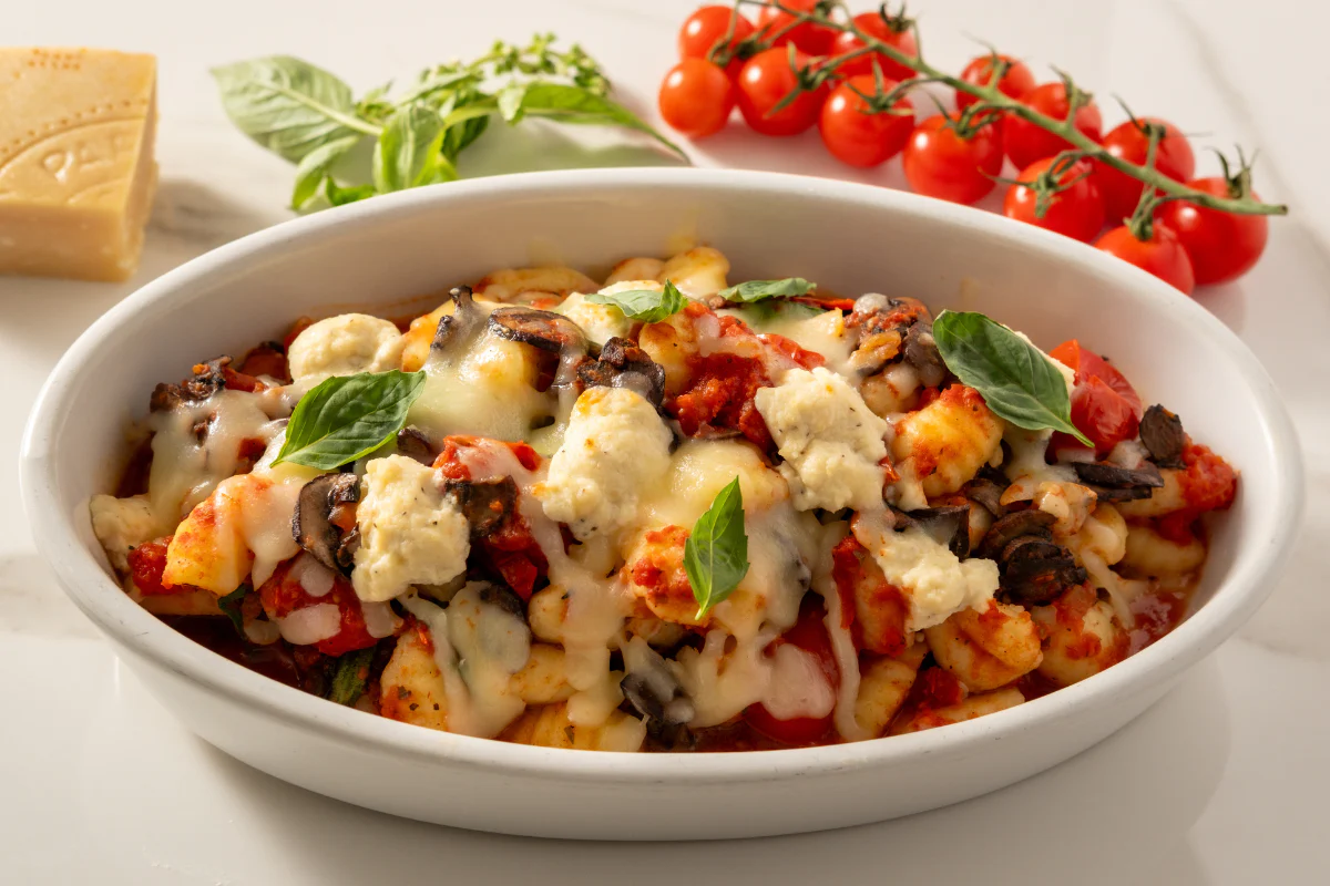 Oven-baked gnocchi with marinara, roasted tomatoes, mushrooms, ricotta, spinach, basil, & melted Italian cheeses