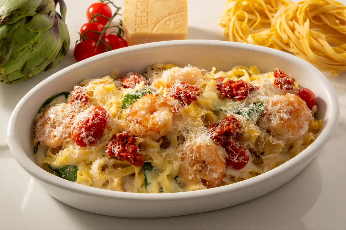 Creamy fettuccine tossed with shrimp, roasted grape tomatoes, artichokes, spinach, & garlic Parmesan cream, topped with mozzarella-Parmesan & baked until golden